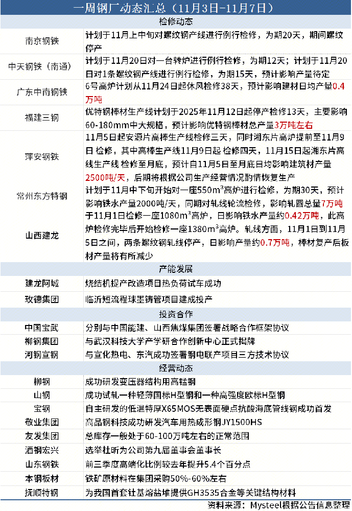 據Mysteel不完全統計,本周(11月3日-11月7日)7家鋼廠(chǎng)發(fā)布檢修信息,具體如下: