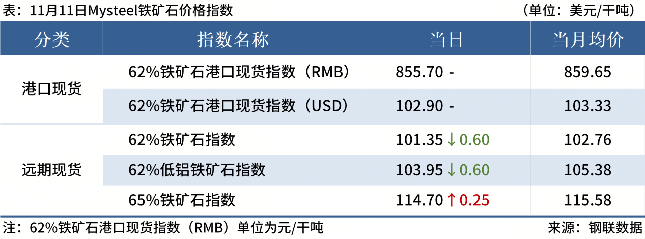 ◎ 11月11日,全國主港鐵礦石成交107.80萬(wàn)噸,環(huán)比減7.1%;237家主流貿易商建筑鋼材成交9.10萬(wàn)噸,環(huán)比減15.6%。