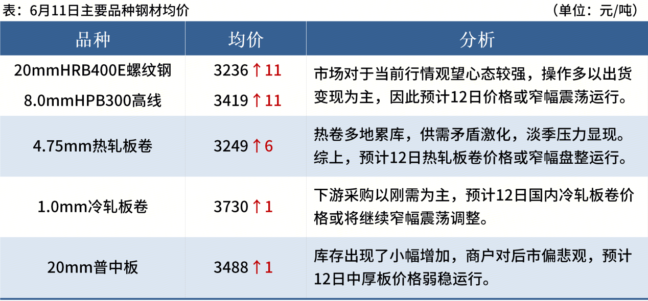 ◎ 6月11日,唐山遷安普方坯資源出廠(chǎng)含稅累計上調20,報2920元/噸。