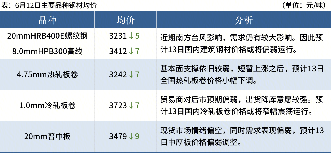◎ 6月12日,國內鋼材市場(chǎng)震蕩偏弱運行,唐山遷安普方坯出廠(chǎng)含稅下跌30報2890元/噸。