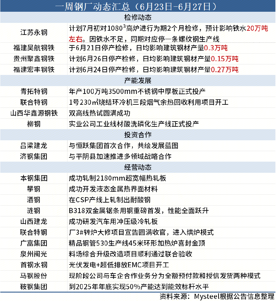據Mysteel不完全統計,本周(6月23日-6月27日)4家鋼廠(chǎng)發(fā)布檢修信息,具體如下: