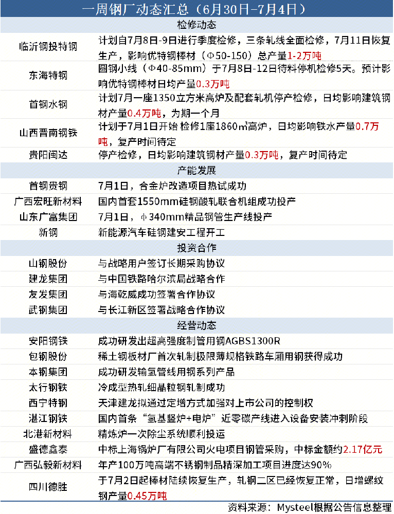 據Mysteel不完全統計,本周(6月30日-7月4日)5家鋼廠(chǎng)發(fā)布檢修信息,具體如下: