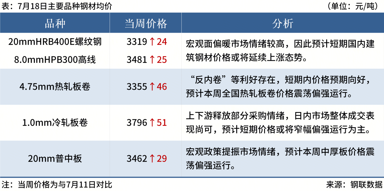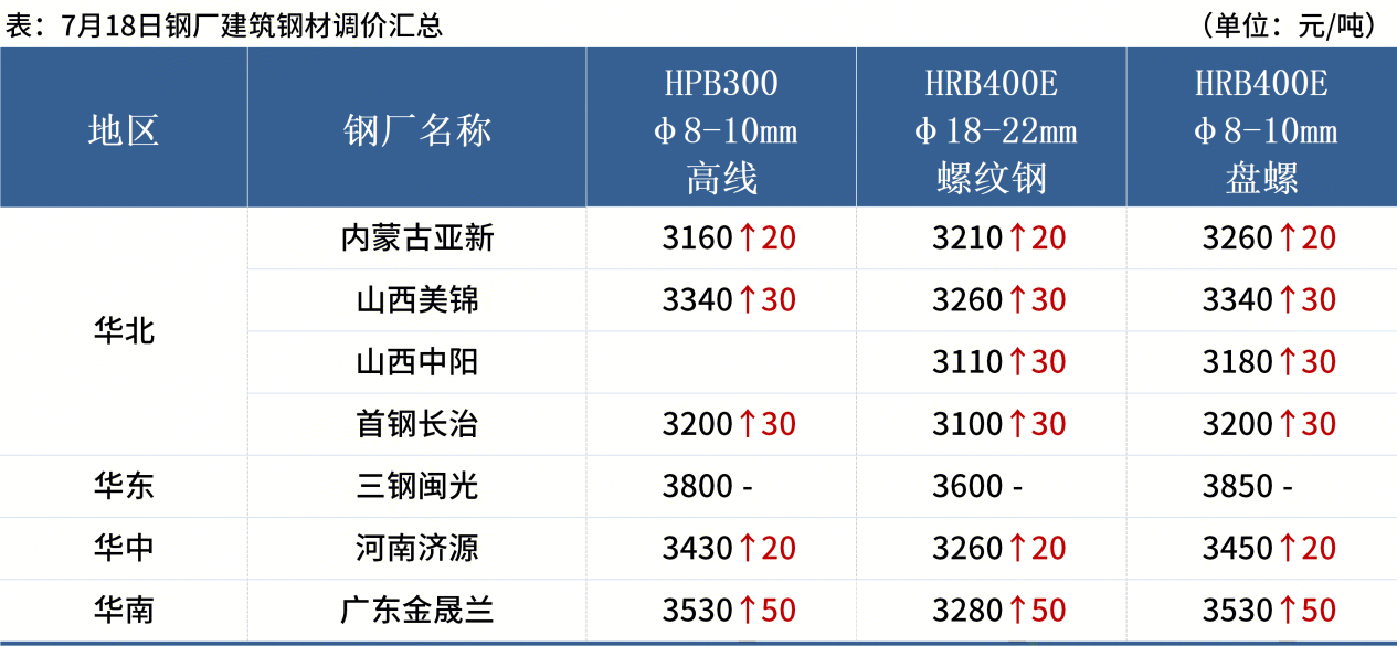 ◎ 7月20日,中天鋼鐵出臺7月下旬價(jià)格:螺紋、線(xiàn)材、盤(pán)螺上調100元/噸。現華東螺紋3430元/噸,線(xiàn)材盤(pán)螺3680元/噸。