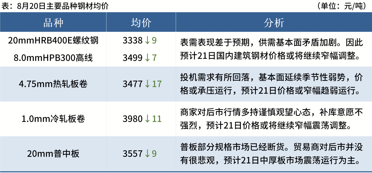 ◎ 8月20日,中天鋼鐵出臺8月下旬價(jià)格,螺紋鋼下調100元/噸,線(xiàn)材盤(pán)螺下調150元/噸。