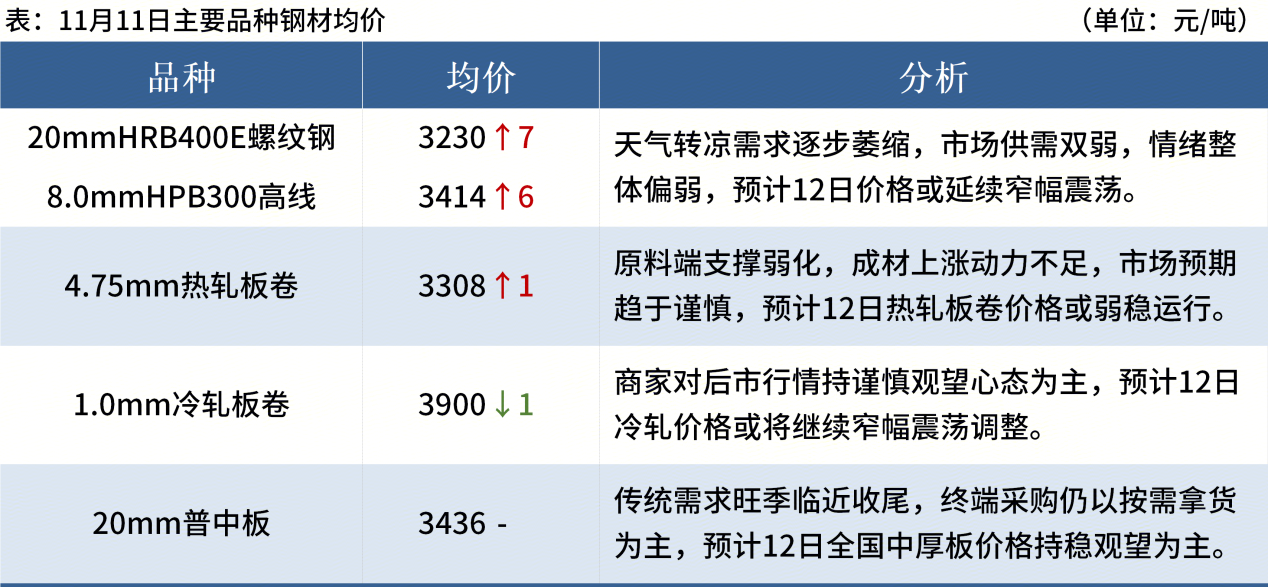 ◎ 11月11日,全國主港鐵礦石成交107.80萬(wàn)噸,環(huán)比減7.1%;237家主流貿易商建筑鋼材成交9.10萬(wàn)噸,環(huán)比減15.6%。